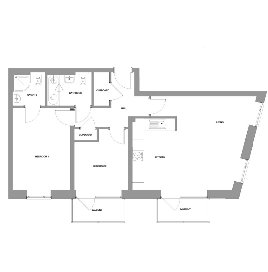The Brentwood features an open-plan kitchen/living/dining room with balcony access, a master bedroom complete with an ensuite bathroom and an additional bedroom that also benefits from having a separate balcony. The apartment also includes a family bathroom and multiple convenient storage cupboards in the hallway.